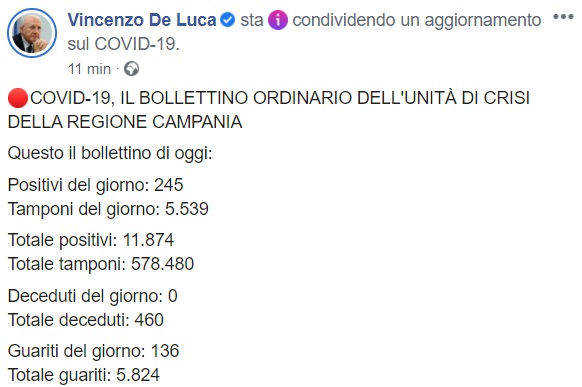 Questo quanto apprendiamo dalla pagina facebook del Pres. De Luca: