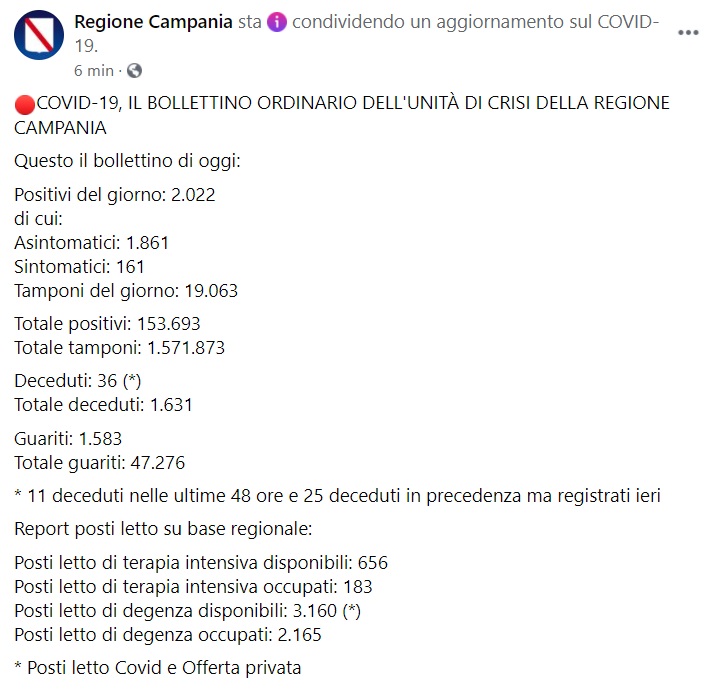 Questo quanto apprendiamo dalla pagina facebook della Regione Campania: