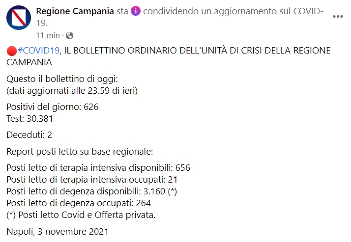 "#COVID19, IL BOLLETTINO ORDINARIO DELL'UNITÀ DI CRISI DELLA REGIONE CAMPANIA Questo il bollettino di oggi: (dati aggiornati alle 23.59 di ieri) Positivi del giorno: 626 Test: 30.381 Deceduti: 2 Report posti letto su base regionale: Posti letto di terapia intensiva disponibili: 656 Posti letto di terapia intensiva occupati: 21 Posti letto di degenza disponibili: 3.160 (*) Posti letto di degenza occupati: 264 (*) Posti letto Covid e Offerta privata."