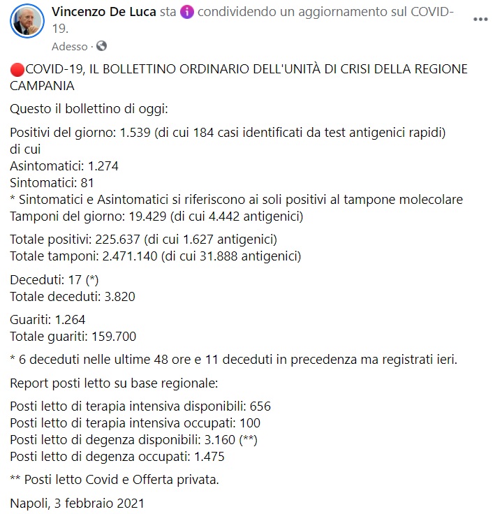 Questo quanto apprendiamo dalla pagina facebook del Pres. De Luca: