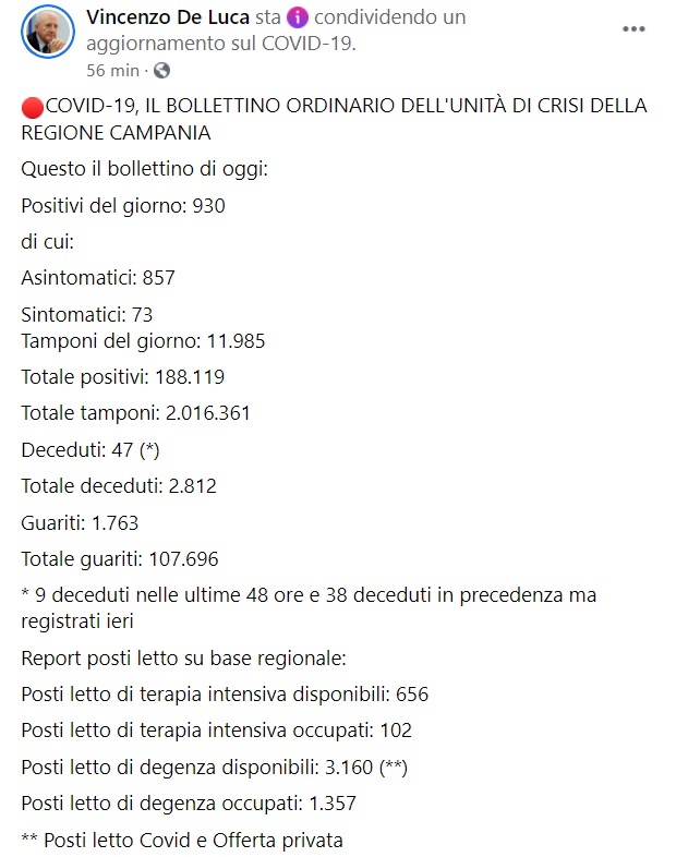 Questo quanto apprendiamo dalla pagina facebook del Pres. De Luca:
