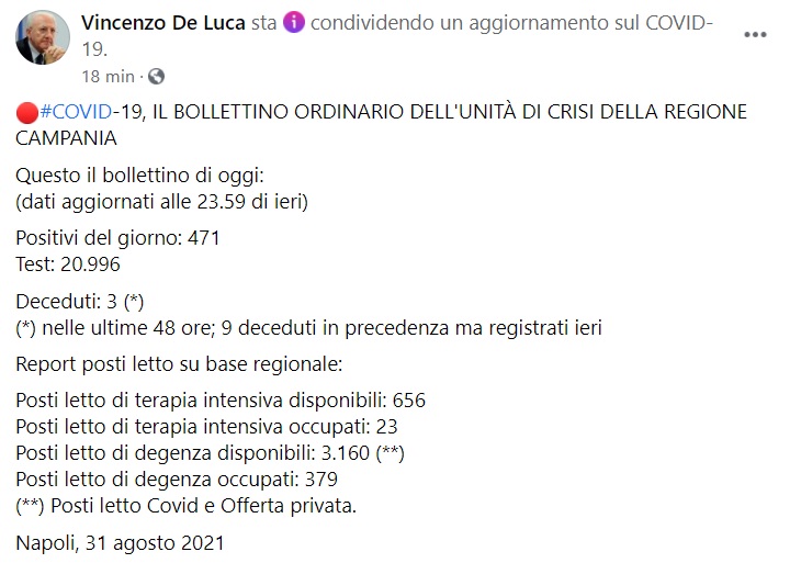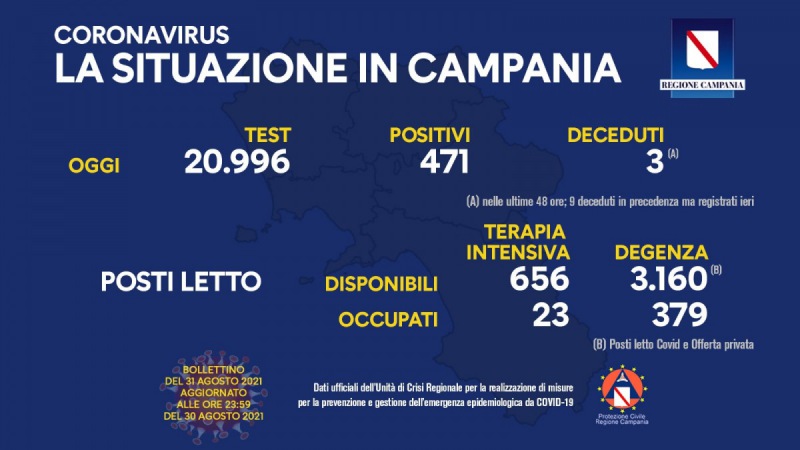 "#COVID-19, IL BOLLETTINO ORDINARIO DELL'UNITÀ DI CRISI DELLA REGIONE CAMPANIA. Questo il bollettino di oggi: (dati aggiornati alle 23.59 di ieri) Positivi del giorno: 471 Test: 20.996 Deceduti: 3 (*) (*) nelle ultime 48 ore; 9 deceduti in precedenza ma registrati ieri Report posti letto su base regionale: Posti letto di terapia intensiva disponibili: 656 Posti letto di terapia intensiva occupati: 23 Posti letto di degenza disponibili: 3.160 (**) Posti letto di degenza occupati: 379 (**) Posti letto Covid e Offerta privata."