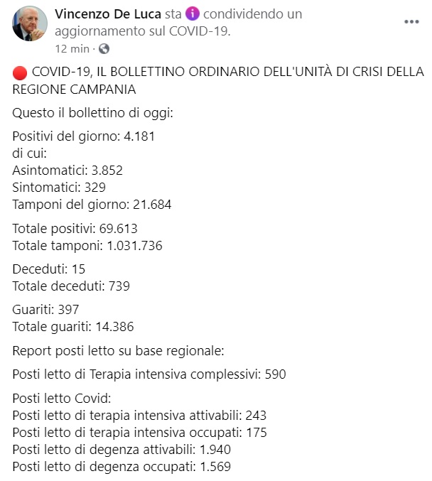 Questo quanto apprendiamo dalla pagina facebook del Pres. De Luca: