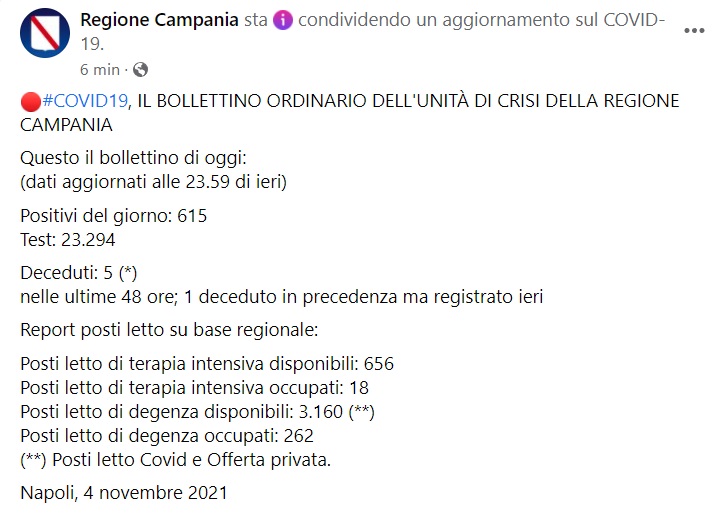 Questo quanto apprendiamo dalla pagina facebook della Regione Campania: