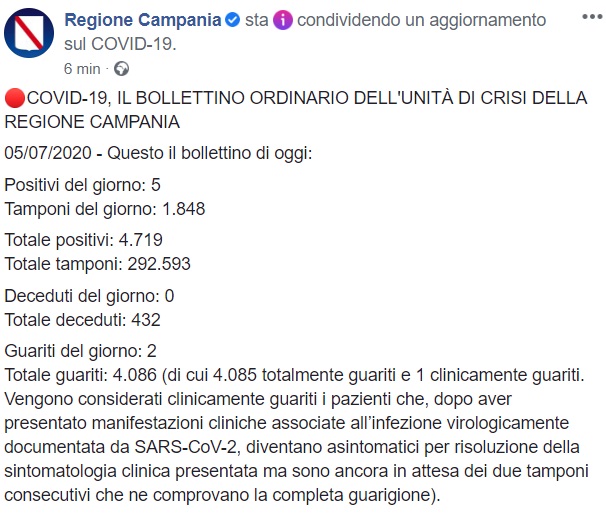 Questo quanto apprendiamo dalla pagina facebook della Regione Campania: