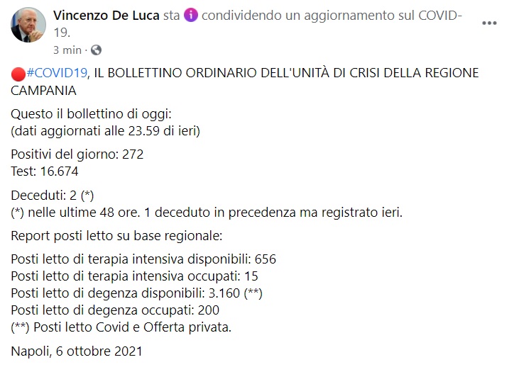 "#COVID19, IL BOLLETTINO ORDINARIO DELL'UNITÀ DI CRISI DELLA REGIONE CAMPANIA Questo il bollettino di oggi: (dati aggiornati alle 23.59 di ieri) Positivi del giorno: 272 Test: 16.674 Deceduti: 2 (*) (*) nelle ultime 48 ore. 1 deceduto in precedenza ma registrato ieri. Report posti letto su base regionale: Posti letto di terapia intensiva disponibili: 656 Posti letto di terapia intensiva occupati: 15 Posti letto di degenza disponibili: 3.160 (**) Posti letto di degenza occupati: 200 (**) Posti letto Covid e Offerta privata."