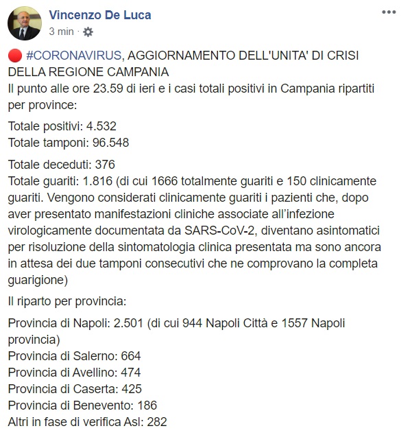 Questo quanto apprendiamo dalla pagina facebook del Pres. De Luca: