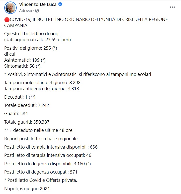 "COVID-19, IL BOLLETTINO ORDINARIO DELL'UNITÀ DI CRISI DELLA REGIONE CAMPANIA. Questo il bollettino di oggi: (dati aggiornati alle 23.59 di ieri) Positivi del giorno: 255 (*) di cui Asintomatici: 199 (*) Sintomatici: 56 (*) * Positivi, Sintomatici e Asintomatici si riferiscono ai tamponi molecolari Tamponi molecolari del giorno: 8.298 Tamponi antigenici del giorno: 3.318 Deceduti: 1 (**) Totale deceduti: 7.242 Guariti: 584 Totale guariti: 350.387 ** 1 deceduto nelle ultime 48 ore. Report posti letto su base regionale: Posti letto di terapia intensiva disponibili: 656 Posti letto di terapia intensiva occupati: 46 Posti letto di degenza disponibili: 3.160 (*) Posti letto di degenza occupati: 571 * Posti letto Covid e Offerta privata."
