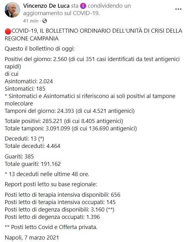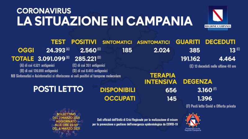 "COVID-19, IL BOLLETTINO ORDINARIO DELL'UNITÀ DI CRISI DELLA REGIONE CAMPANIA. Questo il bollettino di oggi: Positivi del giorno: 2.560 (di cui 351 casi identificati da test antigenici rapidi) di cui Asintomatici: 2.024 Sintomatici: 185 * Sintomatici e Asintomatici si riferiscono ai soli positivi al tampone molecolare Tamponi del giorno: 24.393 (di cui 4.521 antigenici) Totale positivi: 285.221 (di cui 8.405 antigenici) Totale tamponi: 3.091.099 (di cui 136.690 antigenici) Deceduti: 13 (*) Totale deceduti: 4.464 Guariti: 385 Totale guariti: 191.162 * 13 deceduti nelle ultime 48 ore. Report posti letto su base regionale: Posti letto di terapia intensiva disponibili: 656 Posti letto di terapia intensiva occupati: 145 Posti letto di degenza disponibili: 3.160 (**) Posti letto di degenza occupati: 1.396 ** Posti letto Covid e Offerta privata."
