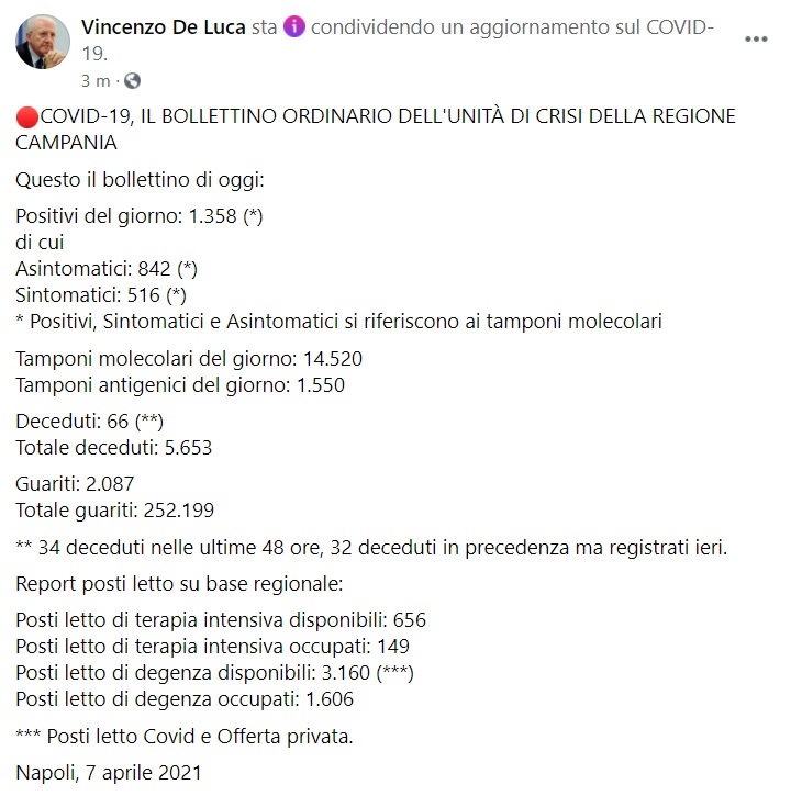 Questo quanto apprendiamo dalla pagina facebook del Pres. De Luca:
