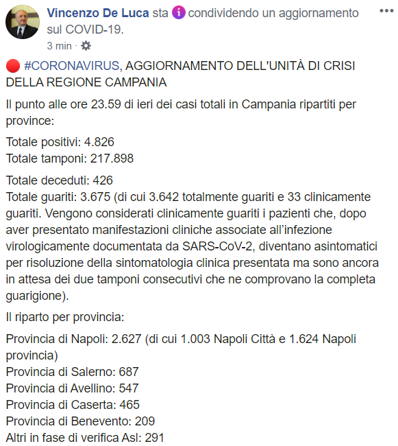 Questo quanto apprendiamo dalla pagina facebook del Pres. De Luca: