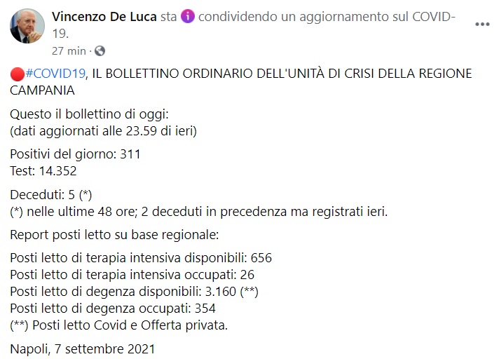 "#COVID19, IL BOLLETTINO ORDINARIO DELL'UNITÀ DI CRISI DELLA REGIONE CAMPANIA Questo il bollettino di oggi: (dati aggiornati alle 23.59 di ieri) Positivi del giorno: 311 Test: 14.352 Deceduti: 5 (*) (*) nelle ultime 48 ore; 2 deceduti in precedenza ma registrati ieri. Report posti letto su base regionale: Posti letto di terapia intensiva disponibili: 656 Posti letto di terapia intensiva occupati: 26 Posti letto di degenza disponibili: 3.160 (**) Posti letto di degenza occupati: 354 (**) Posti letto Covid e Offerta privata."