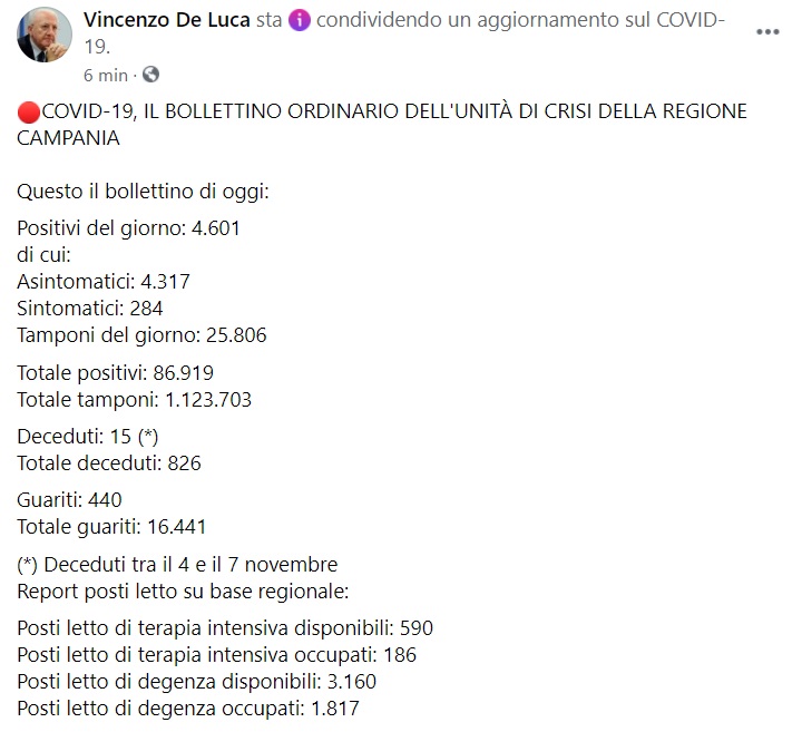 Questo quanto apprendiamo dalla pagina facebook del Pres. De Luca: