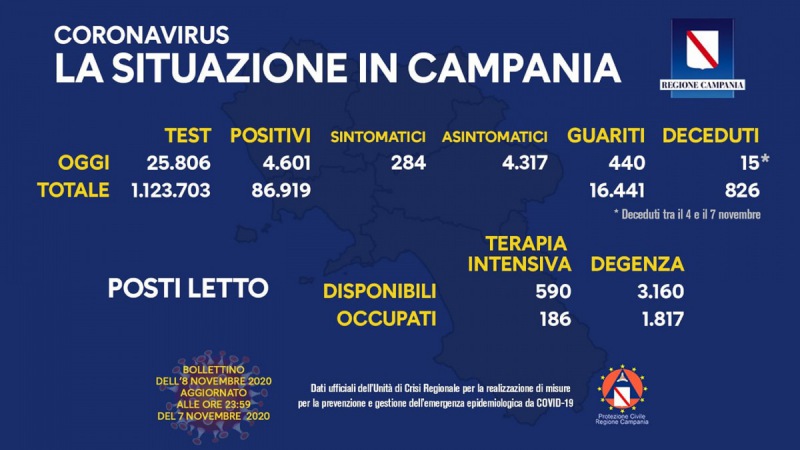 Coronavirus in Campania 8/11. Il bollettino della Regione: 4.601 POSITIVI DEL GIORNO