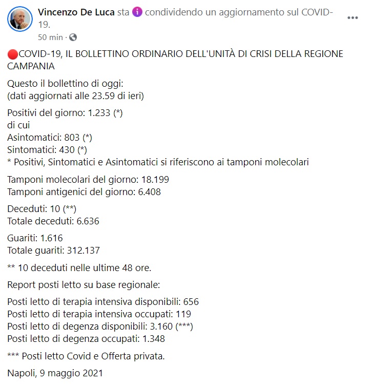 Questo quanto apprendiamo dalla pagina facebook del Pres. De Luca: