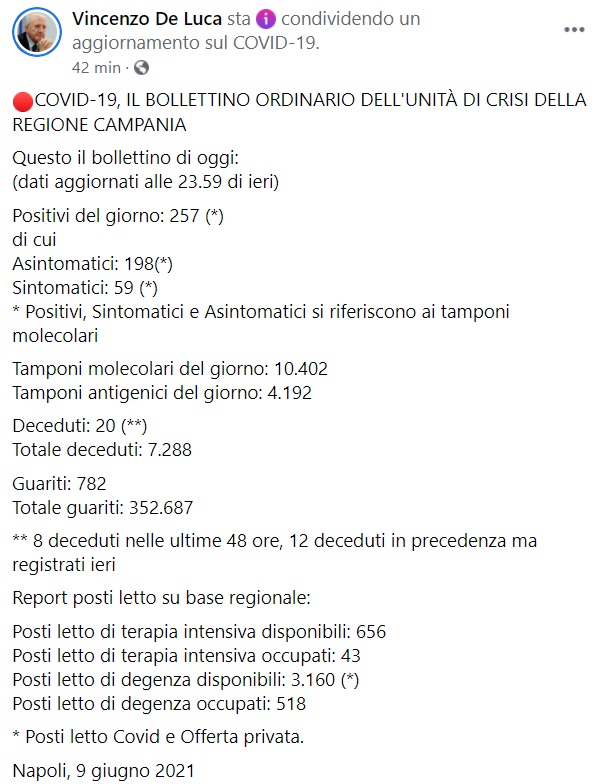 "COVID-19, IL BOLLETTINO ORDINARIO DELL'UNITÀ DI CRISI DELLA REGIONE CAMPANIA. Questo il bollettino di oggi: (dati aggiornati alle 23.59 di ieri) Positivi del giorno: 257 (*) di cui Asintomatici: 198(*) Sintomatici: 59 (*) * Positivi, Sintomatici e Asintomatici si riferiscono ai tamponi molecolari Tamponi molecolari del giorno: 10.402 Tamponi antigenici del giorno: 4.192 Deceduti: 20 (**) Totale deceduti: 7.288 Guariti: 782 Totale guariti: 352.687 ** 8 deceduti nelle ultime 48 ore, 12 deceduti in precedenza ma registrati ieri Report posti letto su base regionale: Posti letto di terapia intensiva disponibili: 656 Posti letto di terapia intensiva occupati: 43 Posti letto di degenza disponibili: 3.160 (*) Posti letto di degenza occupati: 518 * Posti letto Covid e Offerta privata."