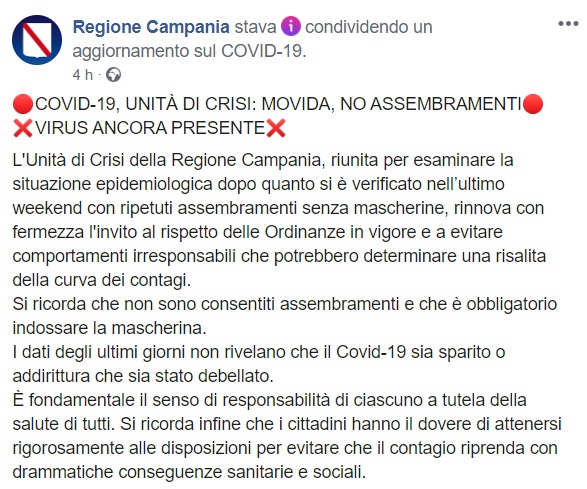 Questo quanto pubbluicato sulla pagina facebook della Regione Campania: