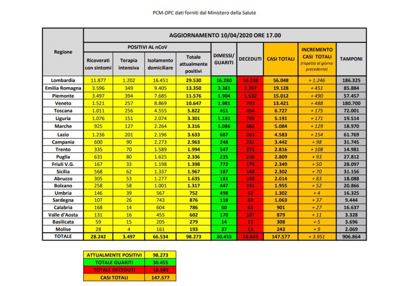 "Nell’ambito del monitoraggio sanitario relativo alla diffusione del nuovo Coronavirus sul territorio nazionale, i casi totali nel nostro Paese sono 147.577, al momento sono 98.273 le persone che risultano positive al virus. Le persone guarite sono 30.455. -Si legge nella nota- I pazienti ricoverati con sintomi sono 28.242, in terapia intensiva 3.497, mentre 66.534 si trovano in isolamento domiciliare. I deceduti sono 18.849, questo numero, però, potrà essere confermato solo dopo che l’Istituto Superiore di Sanità avrà stabilito la causa effettiva del decesso. Il capo della protezione civile Borrelli ha sottolineato che sono arrivate donazioni pari a 107 milioni di euro, somma che verrà utilizzata per acquisizioni di DPI."