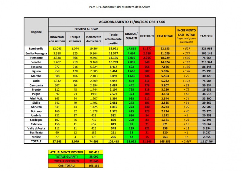 Questi i dati della Prot. Civile in merito al contagio da Coronavirus. Gli attuali positivi sono 105.418 che portano ad un complessivo di 165.155 casi totali. Di questi 38.092 sono i guariti e 21.645 (conferma dati in attesa dell'I.S.S.) i deceduti.