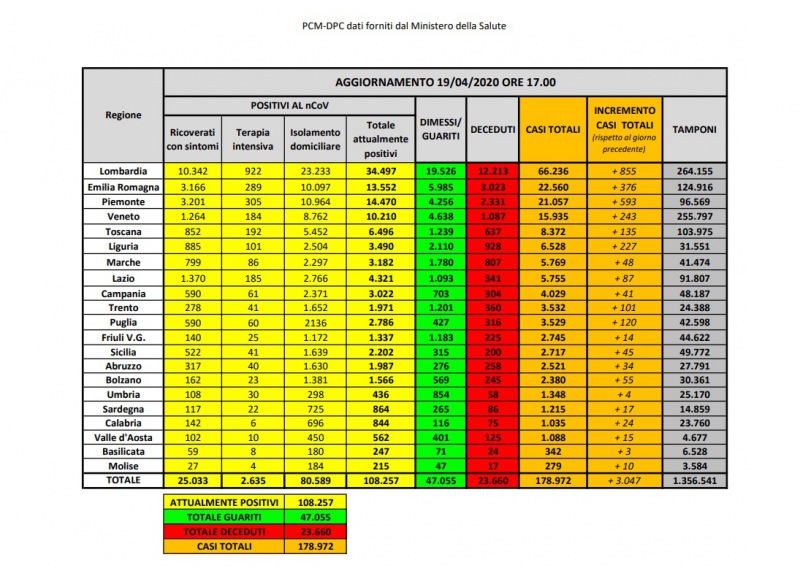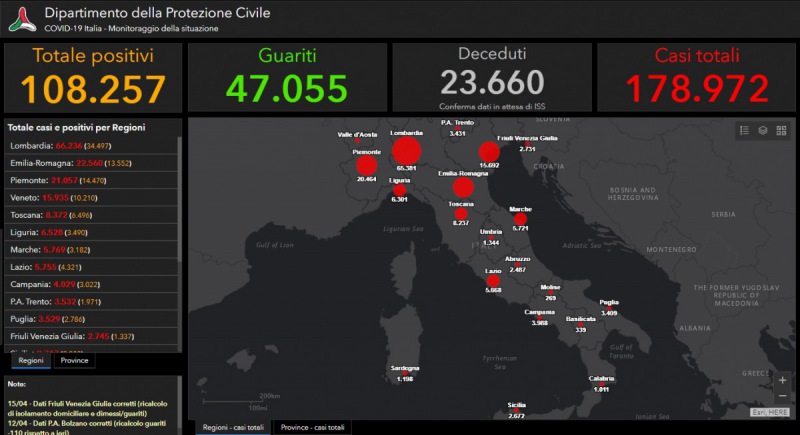Questi i dati emanati dalla Protezione Civile in merito al contagio da Coronavirus. Totale positivi 108.257, guariti 47.055, deceduti 23.660 (Conferma dati in attesa di ISS) e casi totali 178.972.