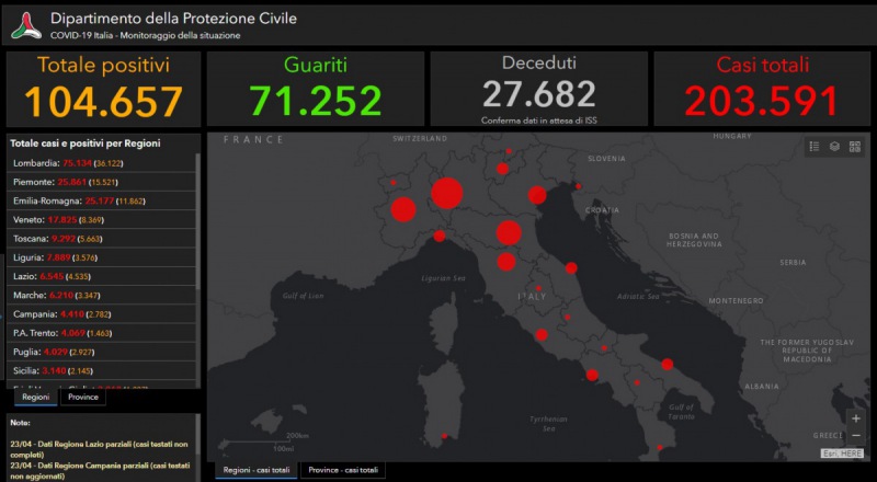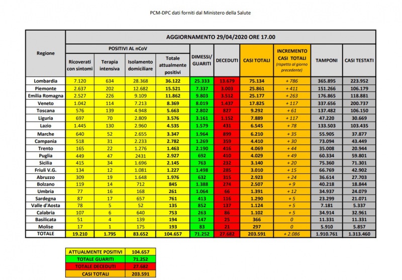 "Le persone attualmente positive sono 104.657, i guariti sono 71.252. Nell’ambito del monitoraggio sanitario relativo alla diffusione del nuovo Coronavirus sul territorio nazionale, i casi totali nel nostro Paese sono 203.291, al momento- si legge nella nota- sono 104.657 le persone che risultano positive al virus. Le persone guarite sono 71.252. I pazienti ricoverati con sintomi sono 19.210 in terapia intensiva 1.795, mentre 83.652 si trovano in isolamento domiciliare. I deceduti- si legge nel comunicato- sono 27.682 questo numero, però, potrà essere confermato solo dopo che l’Istituto Superiore di Sanità avrà stabilito la causa effettiva del decesso."