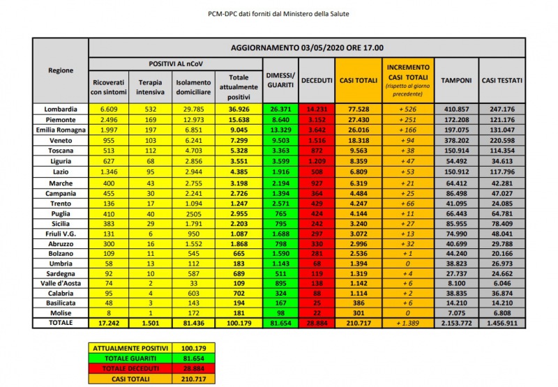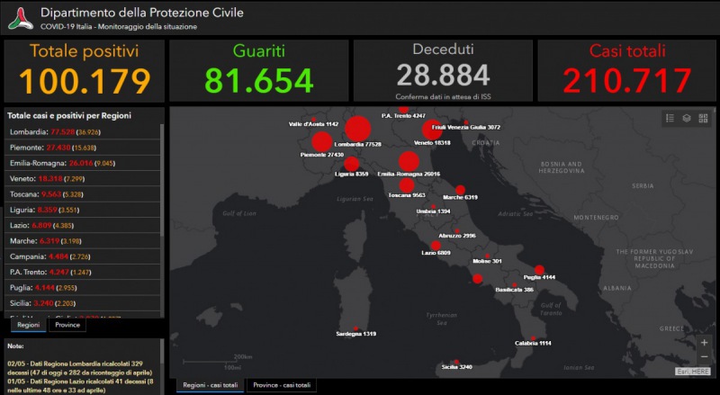"Le persone attualmente positive sono 100.179, i guariti sono 81.654. Nell’ambito del monitoraggio sanitario relativo alla diffusione del nuovo Coronavirus sul territorio nazionale, i casi totali nel nostro Paese sono 210.717, al momento- si legge nella nota- sono 100.179 le persone che risultano positive al virus. Le persone guarite sono 81.654. I pazienti ricoverati con sintomi sono 17.242, in terapia intensiva 1.501, mentre 81.436 si trovano in isolamento domiciliare. I deceduti- si legge nel comunicato- sono 28.884 questo numero, però, potrà essere confermato solo dopo che l’Istituto Superiore di Sanità avrà stabilito la causa effettiva del decesso."
