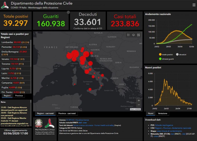 Questi i dati emanati dal Dipartimento Prot. Civile in merito alla situazione dei contagi da Coronavirus in Italia: 39.297 i positivi attuali, 160.938 i guariti, 33.601 i deceduti (in attesa conferma I.S.S.) su un totale di 233.836 casi.