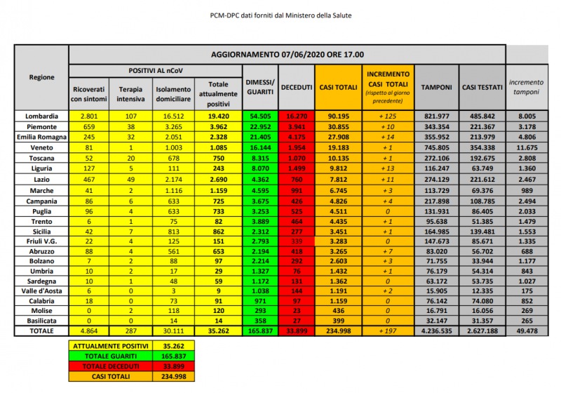 Questa i dati odierni emanati dal Dipartimento Prot. Civile in merito alla situazione dei contagi da Coronavirus in Italia: 35.262 i positivi attuali, 165.837 i guariti e 33.899 i deceduti (in attesa conferma I.S.S.) su un totale di 234.998 casi.