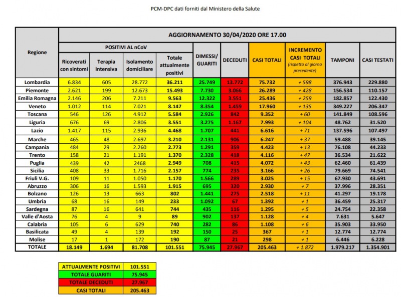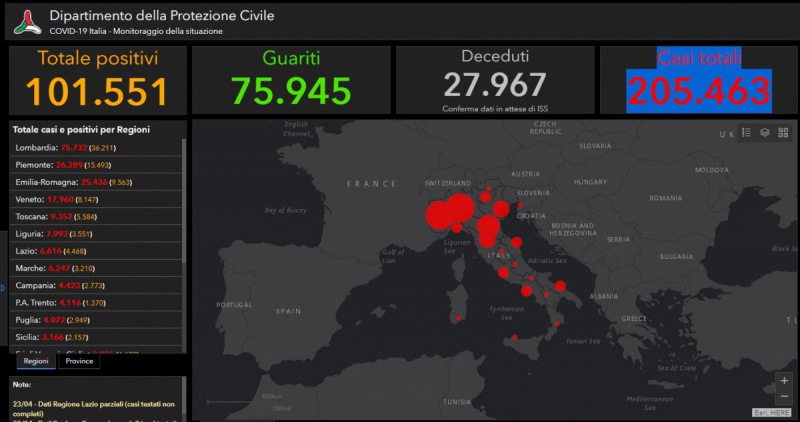 Questi i dati emanati dalla Prot. Civile in merito al contagio da Coronavirus: Positivi 101.551, guariti 75.945, deceduti 27.967, casi totali 205.463.