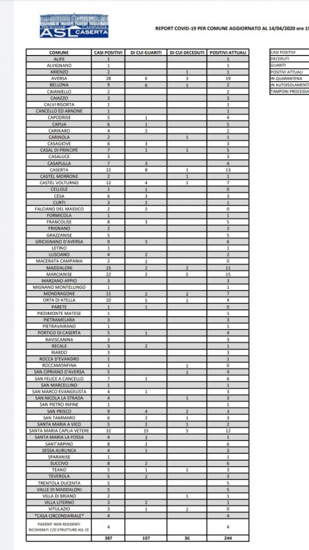 Questi i dati pubblicati dall'ASL Caserta sui contagi da Coronavirus in Provincia suddivisi Comune per Comune