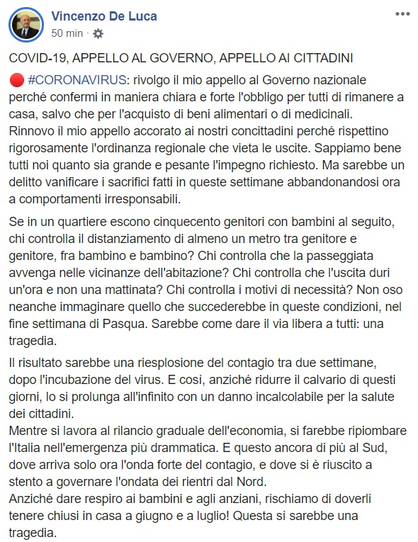Questo quanto apprendiamo dalla apgina facebook del Pres. De Luca: