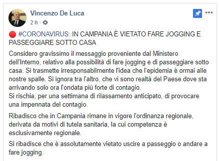In merito alla comunicazione del Ministero dell'Interno riguardo al fatto che un "genitore può camminare con i propri figli minori in prossimità propria abitazione", notizia di cui ne abbiamo parlato qui, è giunta la replica del Governatore De Luca.