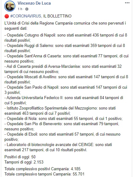 Questo quanto pubblicato dal Pres. De Luca