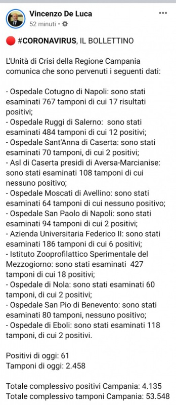 L'Unità di Crisi della Regione Campania comunica che sono pervenuti i seguenti dati: