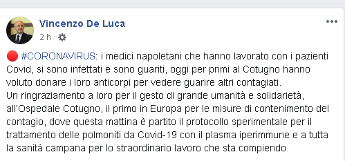 "CORONAVIRUS: i medici napoletani che hanno lavorato con i pazienti Covid, si sono infettati e sono guariti, oggi per primi al Cotugno hanno voluto donare i loro anticorpi per vedere guarire altri contagiati. Un ringraziamento a loro per il gesto di grande umanità e solidarietà, all’Ospedale Cotugno, il primo in Europa per le misure di contenimento del contagio, dove questa mattina è partito il protocollo sperimentale per il trattamento delle polmoniti da Covid-19 con il plasma iperimmune e a tutta la sanità campana per lo straordinario lavoro che sta compiendo."