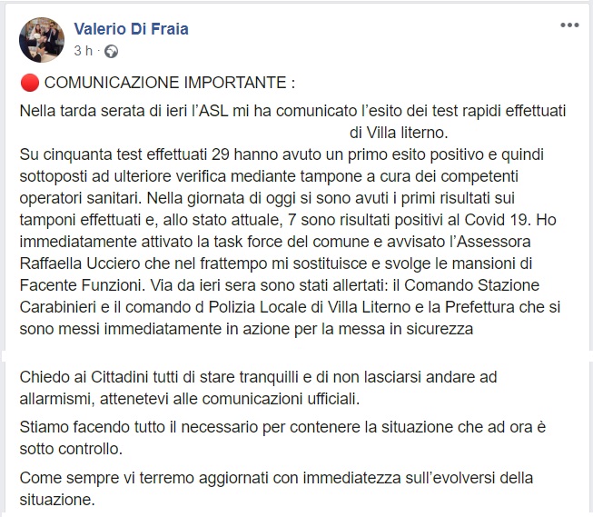 Questo quanto apprendiamo dal Sindaco F.F. di Villa Literno Valerio Di Fraia