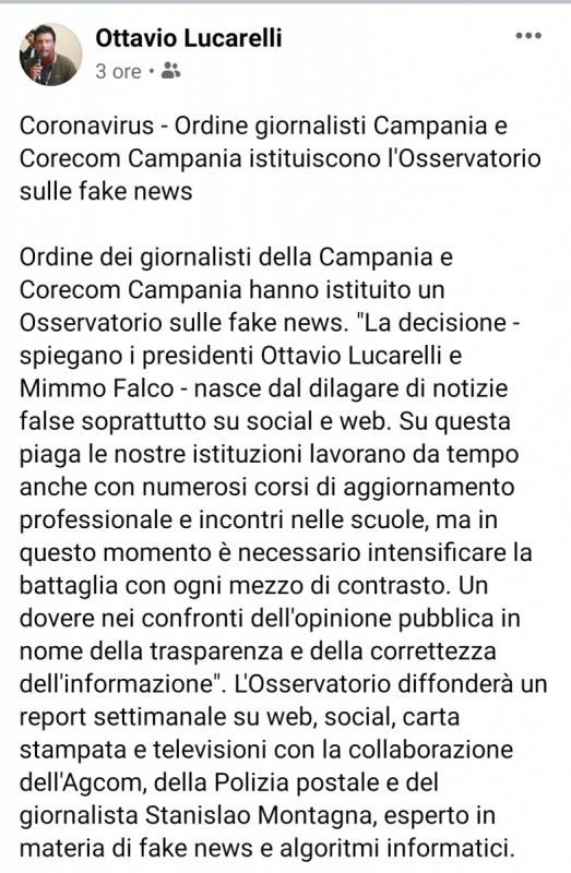 Lo apprendiamo dalla bacheca Facebook del Presidente dell'Ordine dei Giornalisti della Campania: