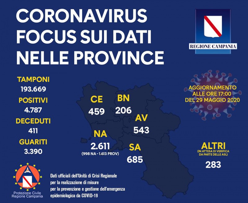 Il punto alle ore 23.59 di ieri con i casi registrati in Campania ripartiti per province: