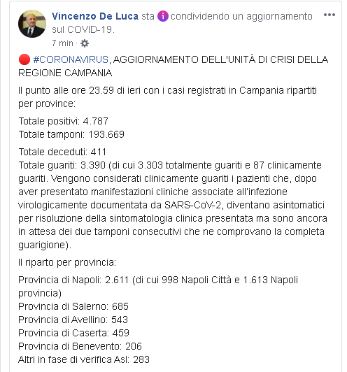Lo apprendiamo dalla pagina Facebook del Governatore della Regione Campania, Vincenzo De Luca: