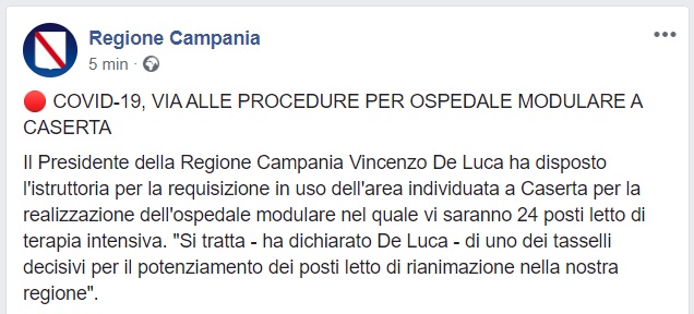 Questo quanto comunicato dalla pagina fb della Regione Campania