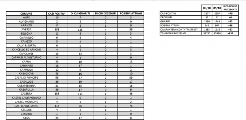 Coronavirus. Più 70 casi in un giorno in prov. Scende Ce, Marcianise a 67. I dati comune x comune