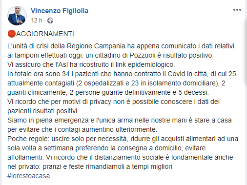L'unità di crisi della Regione Campania ha appena comunicato i dati relativi ai tamponi effettuati oggi: un cittadino di Pozzuoli è risultato positivo. Vi assicuro che l'Asl ha ricostruito il link epidemiologico. In totale ora sono 34 i pazienti che hanno contratto il Covid in città, di cui 25 attualmente contagiati (2 ospedalizzati e 23 in isolamento domiciliare), 2 guariti clinicamente, 2 persone guarite definitivamente e 5 decessi. Vi ricordo che per motivi di privacy non è possibile conoscere i dati dei pazienti risultati positivi. Siamo in piena emergenza e l'unica arma nelle nostre mani è stare a casa per evitare che i contagi aumentino ulteriormente. Poche regole: uscire solo per necessità, ridurre gli acquisti alimentari ad una sola volta a settimana preferendo la consegna a domicilio, evitare affollamenti. Vi ricordo che il distanziamento sociale è fondamentale anche nel privato: pranzi e feste rimandiamoli a tempi migliori".