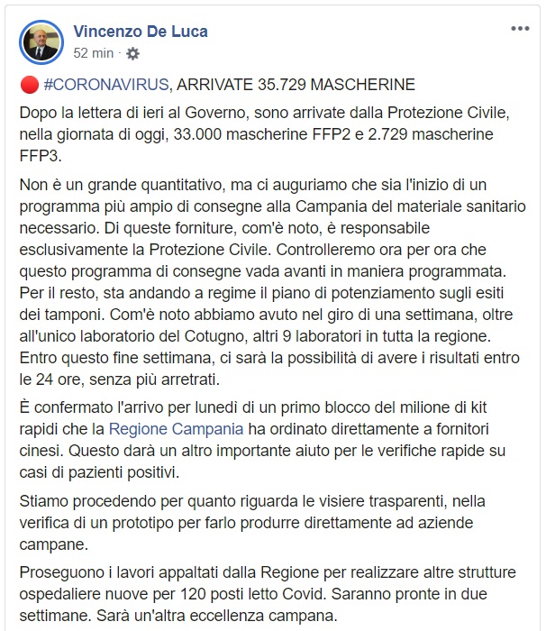 Coronavirus. Pres. De Luca: "Arrivate 35.729 mascherine in Campania"