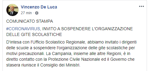 D'intesa con l'Ufficio Scolastico Regionale, abbiamo invitato i dirigenti delle scuole a sospendere l'organizzazione delle gite scolastiche per motivi precauzionali. La Campania, insieme alle altre Regioni, è in diretto contatto con la Protezione Civile Nazionale ed il Governo che stasera riunisce il Consiglio dei Ministri."