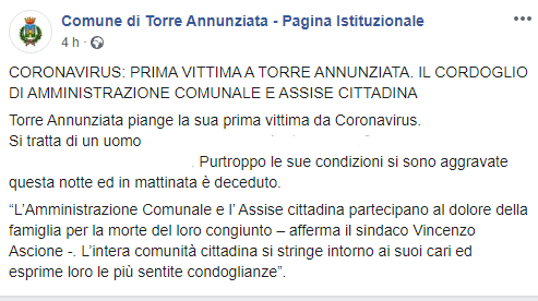 Torre Annunziata piange la sua prima vittima da Coronavirus. Si tratta di un uomo... Purtroppo le sue condizioni si sono aggravate questa notte ed in mattinata è deceduto. “L’Amministrazione Comunale e l’Assise cittadina partecipano al dolore della famiglia per la morte del loro congiunto – afferma il sindaco Vincenzo Ascione -. L’intera comunità cittadina si stringe intorno ai suoi cari ed esprime loro le più sentite condoglianze”.