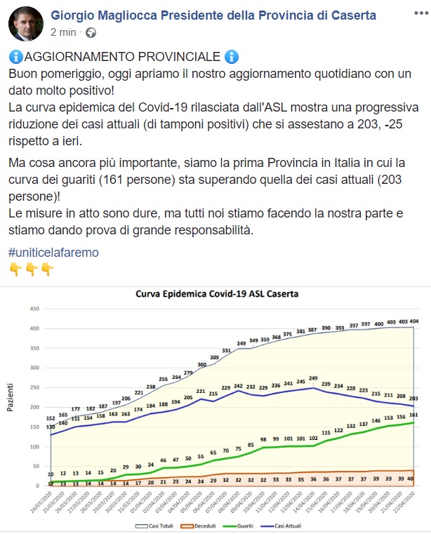 Coronavirus Prov. di Ce. H 18. "Curva guariti sta superando curva casi attuali. Prima Prov. in italia"
