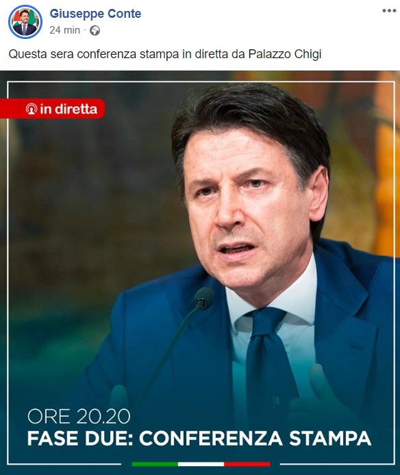 Questo quanto apprendiamo dalla pagina facebook del Premier Conte: