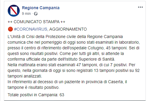 L'Unità di Crisi della Protezione civile della Regione Campania comunica che nel pomeriggio di oggi sono stati esaminati in laboratorio, presso il centro di riferimento dell'ospedale Cotugno, 45 tamponi. Sei di questi sono risultati positivi. Come per tutti gli altri, si attende la conferma ufficiale da parte dell'Istituto Superiore di Sanità. Nella mattinata erano stati esaminati 47 tamponi, di cui 7 positivi. Per questo, nella giornata di oggi si sono registrati 13 tamponi positivi su 92 tamponi analizzati. In riferimento al decesso di un paziente in provincia di Caserta, il tampone è risultato positivo. Totale positivi in Campania: 63".