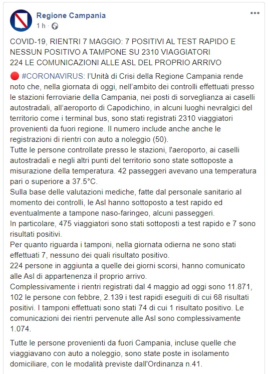 Questo quanto comunicato dalla Regione Campania
