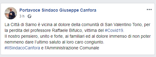 "La Città di Sarno è vicina al dolore della comunità di San Valentino Torio, per la perdita del professore Raffaele Bifulco, vittima del Covid19. Il nostro pensiero, unito e forte, ai familiari ed al dolore immenso di non poter nemmeno dare l’ultimo saluto al loro caro congiunto. Il Sindaco Canfora e l'Amministrazione Comunale".